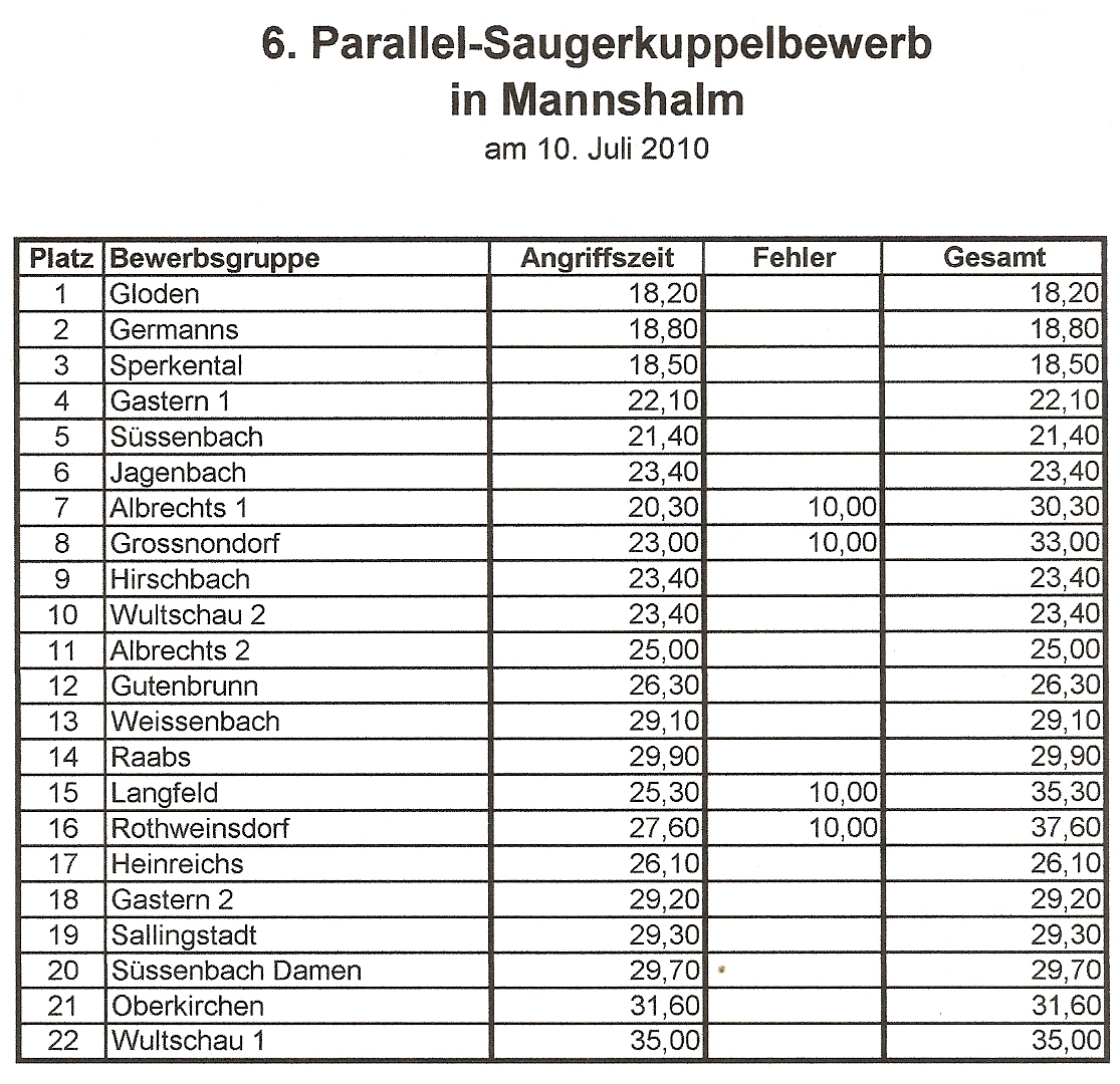 Parallelsaugerkuppelbewerb in Mannshalm Am 10. Juli 2010 fand in Mannshalm der 6. Parallelsaugerkuppelbewerb statt. Der Bewerb wurde mit 2 Grunddurchgängen gestartet. Danach qualifizierten sich die 16 besten Mannschaft für das KO-System. Die Feuerwehr Jagenbach nahm mit einer Gruppe an diesem Bewerb teil. Im Grunddurchgang erreichte die FF Jagenbach den neunten Platz. Dadurch mussten wir im Achtelfinale gegen den achten, Rothweinsdorf, antreten. In diesem Durchgang konnten wir uns klar durchsetzen. Im Viertelfinale trafen wir auf die Bewerbsgruppe der FF Germanns. Trotz einer eher "schlechteren" Zeit der FF Germanns schieden wir aus. Durch 4 Fehlerfreie Durchgänge erreichten wir schlussendlich den guten 6. Platz. Ergebnis